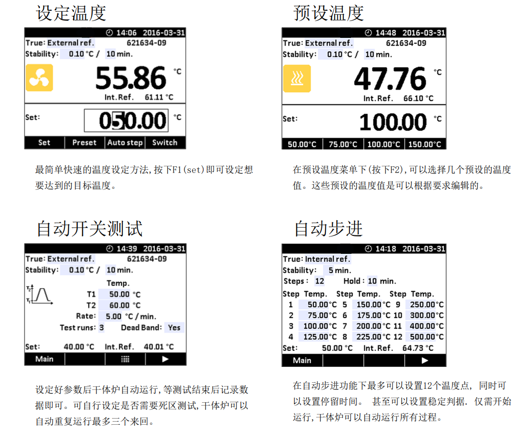 CTC系列干體爐是一款為現(xiàn)場實用設(shè)計的快速、節(jié)省時間,可靠的干體式溫度校準(zhǔn)儀。易于閱讀的大型彩色顯示器顯示圖標(biāo)和校準(zhǔn)器的狀態(tài)以及校準(zhǔn)過程中的信息。特殊的一鍵一功能按鈕,可提供自動開關(guān)測試和自動步進(jìn)等常用功能。速度,便攜性,清潔度和較寬的溫度范圍都優(yōu)于液體浴系統(tǒng)。
