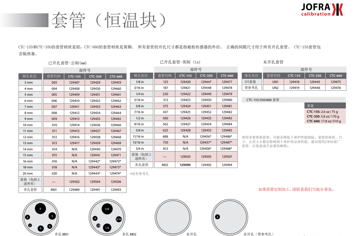 CTC系列提供多種套管選擇,覆蓋幾乎所有的被校傳 感器尺寸。 新的CTC低溫干體爐提供了比上一代產(chǎn)品大35%的套管,用于校準(zhǔn)被校傳感器。 我們也提供包含多種常用傳感器尺寸的多孔套管,使用時更加靈活。