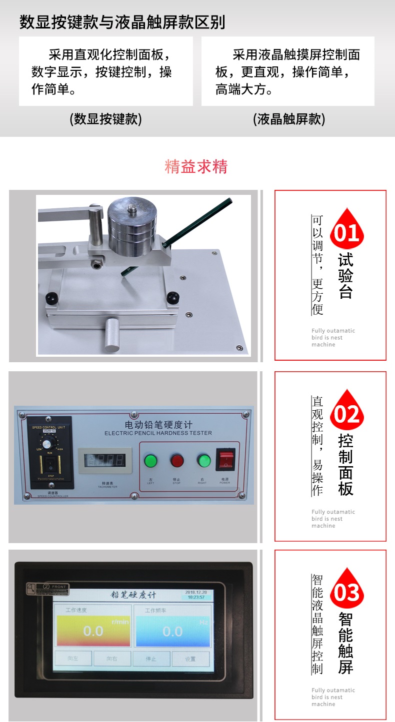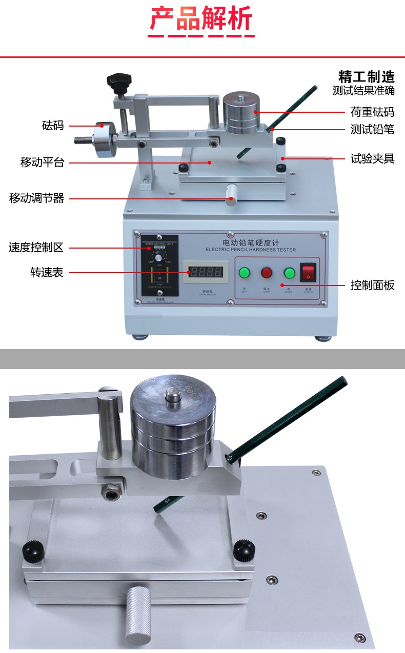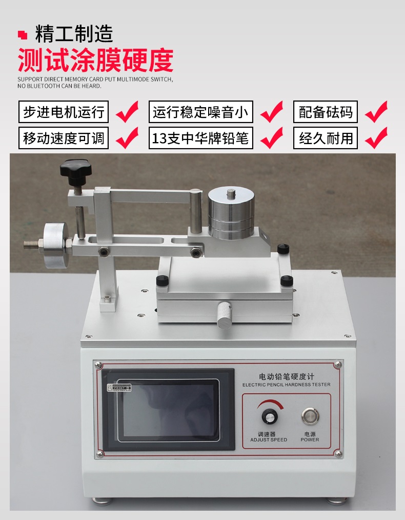 電動鉛筆硬度計為電動(半自動)控制,機器通過一個步進電機運動過傳動,實現前后動作,噪聲小,穩定!測試行程依具體要求可調!