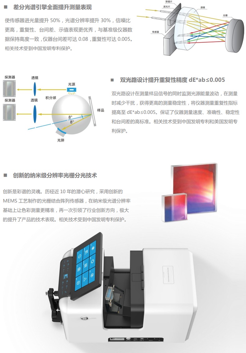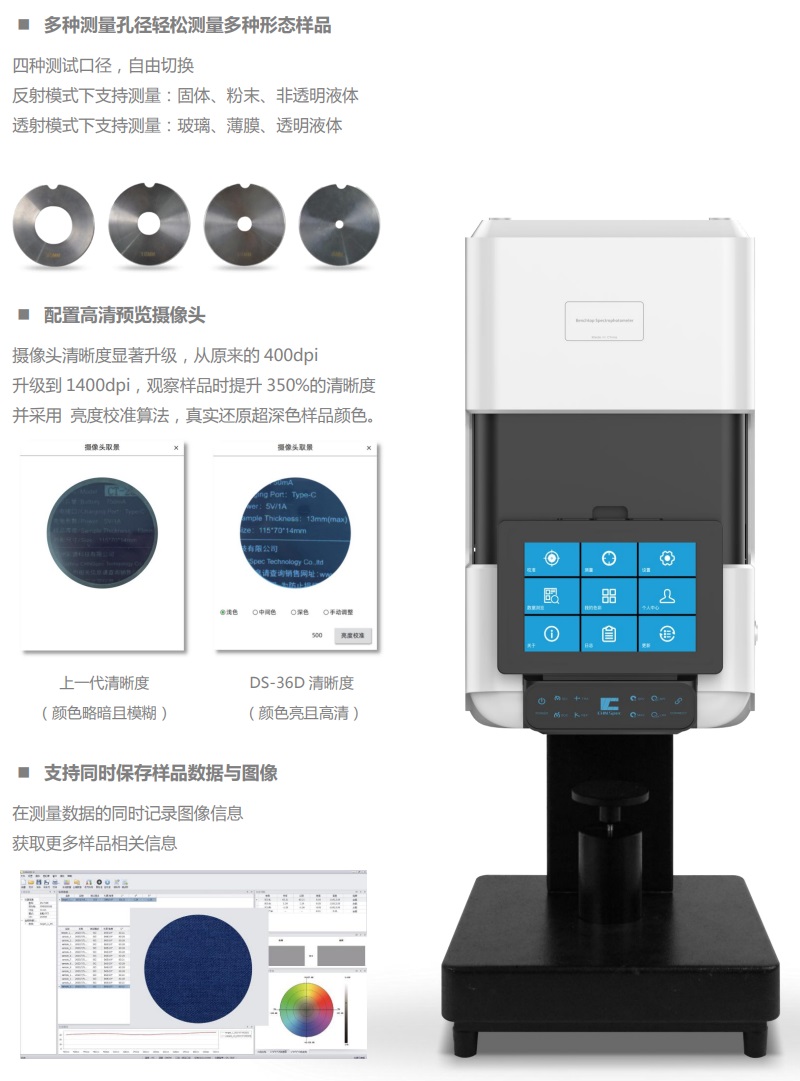 基準級臺式分光測色儀WDS-36D系列采用自研差分光譜引擎,使進光量提升50%,光譜分辨率提升30%;提供更優異的重復性、臺間差、示值表現;攝像頭清晰度提升了350%,通過自研的亮度校準算法,真實還原超深色樣品顏色;強大的ColorExpert電腦數據管理軟件,支持同時保存樣品數據與圖像。