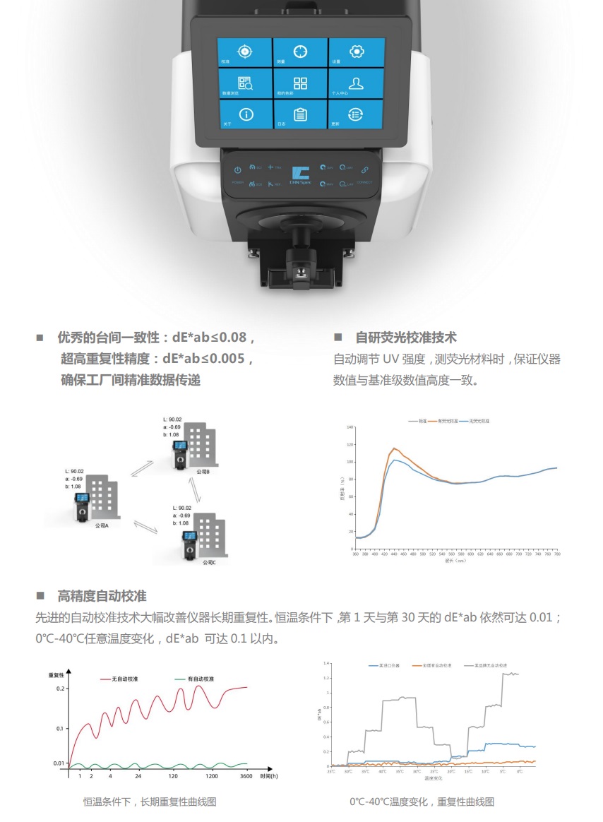 長期重復性*** XLAV色度值:標準偏差ΔE*ab 0.01以內(恒溫條件下,24小時內每小時測量一次白色校正板)