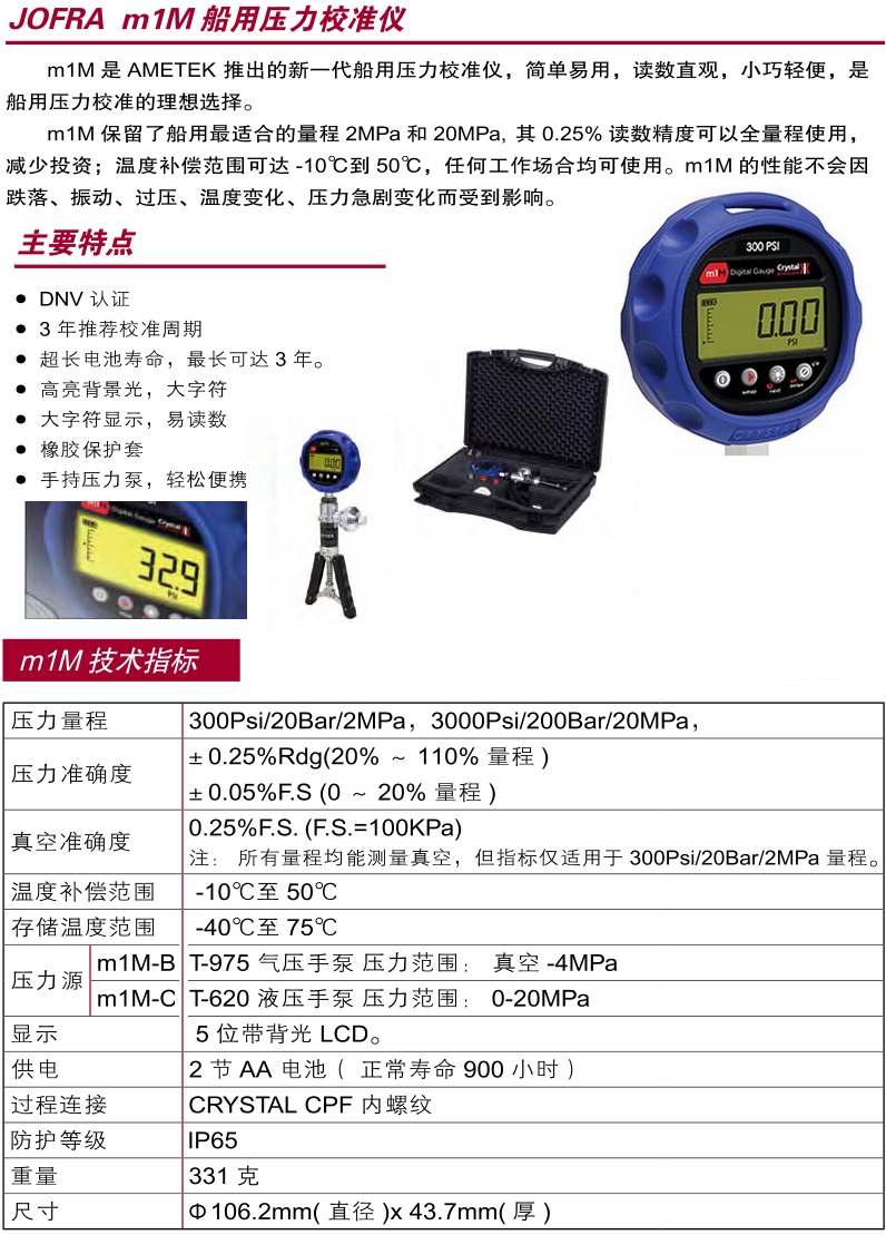 m1m是AMETEK推出的新一代船用壓力校準儀,簡單易用,讀數直觀,小巧輕便,是船用壓力校準的理想選擇。